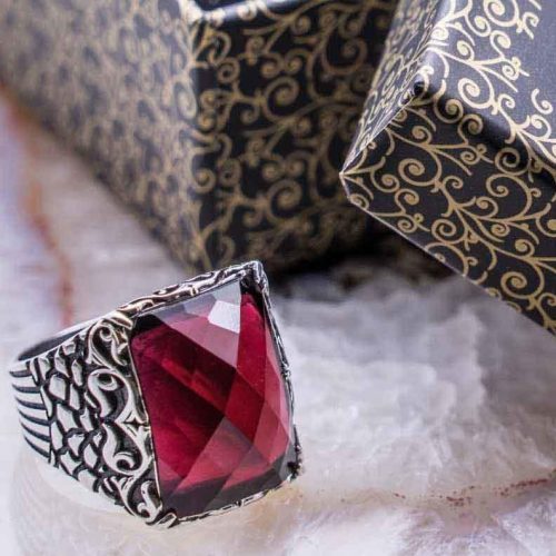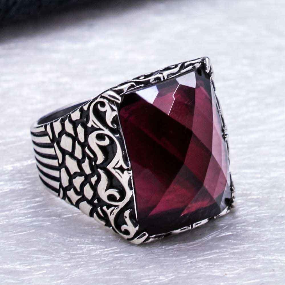 925 Sterling Silver Ring for Men with Red Zircon Stone