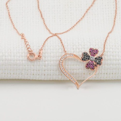 925 Sterling Silver Rose Women Necklace with Zircon Stone and Heart Design