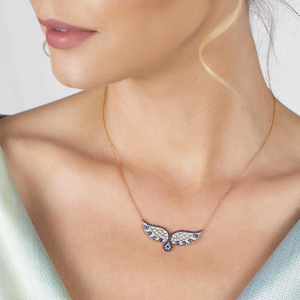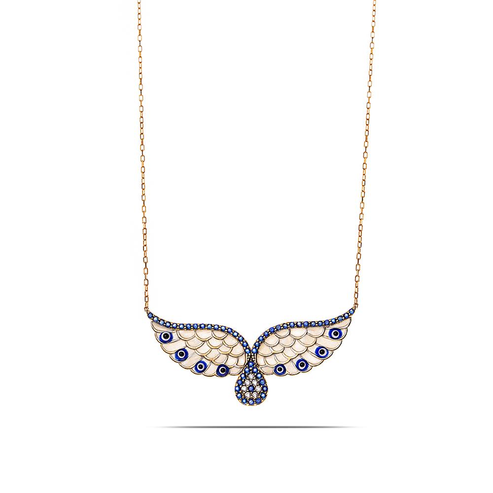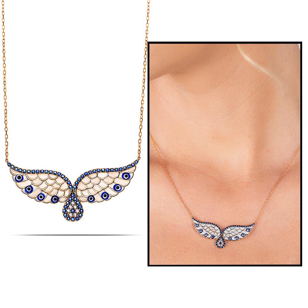 Angel Wing Design with Evil Eye Beads Rose Gold Plated Silver Women Necklace
