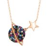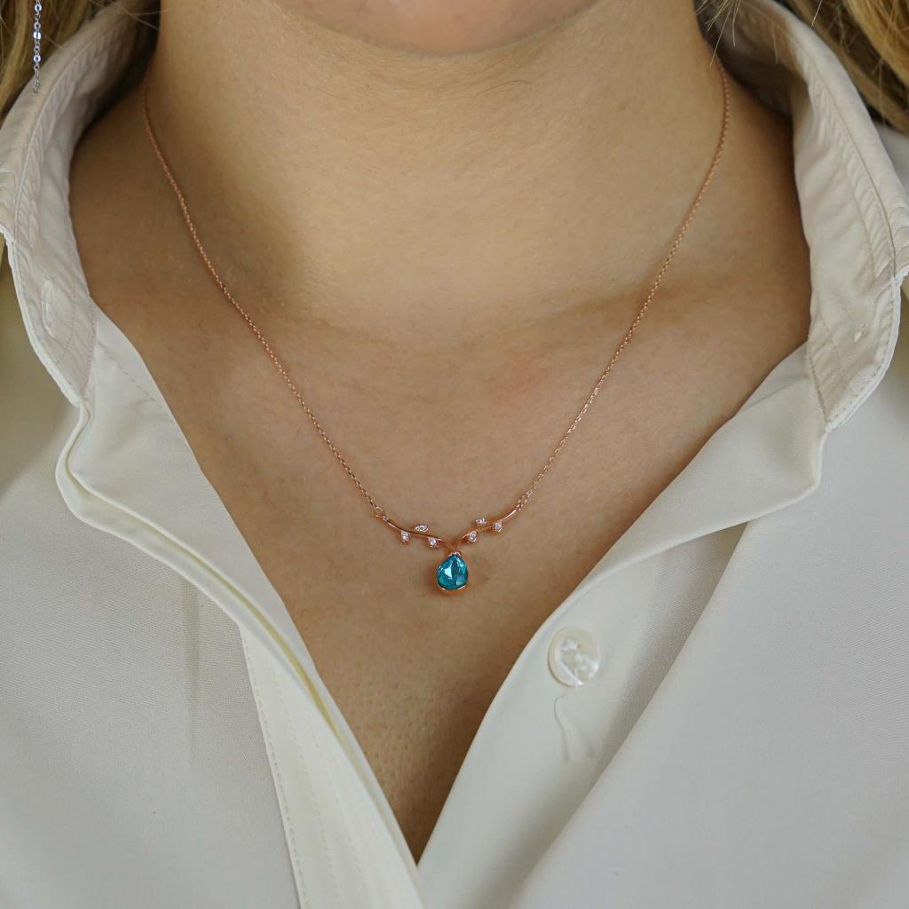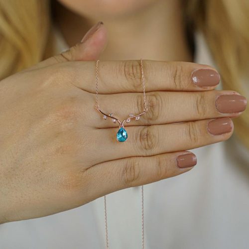 Blue Drop Stone and Leaf Design Rose Plated Silver Women Necklace
