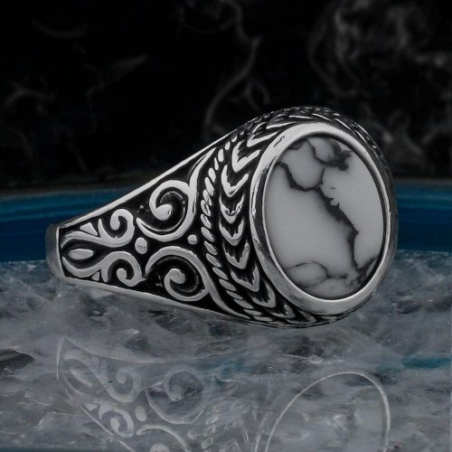 Circular Design Oval White Turquoise Stone 925 Sterling Silver Men Ring
