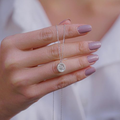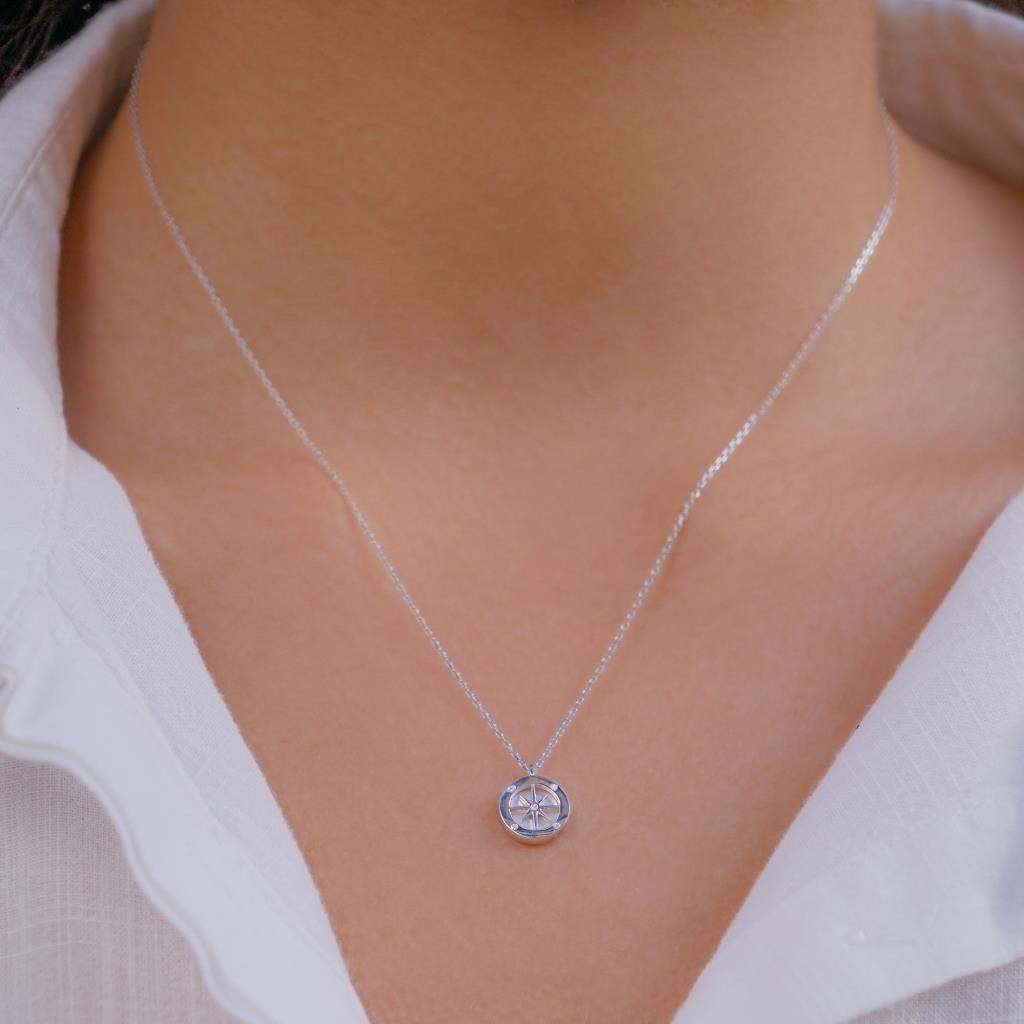 Compass Design Nacre Stone Silver Women Necklace