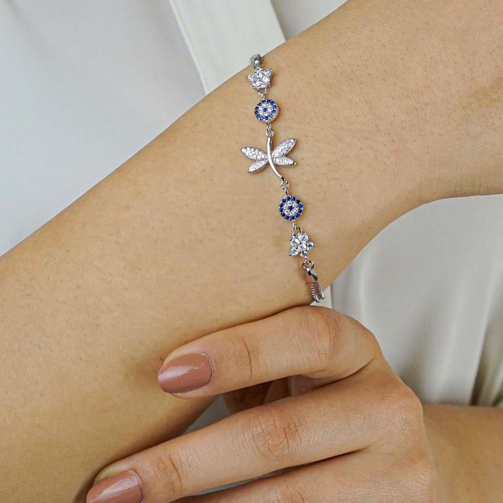 Dragonfly Design Flower Evil Eye Detail 925 Sterling Silver Women Bracelet