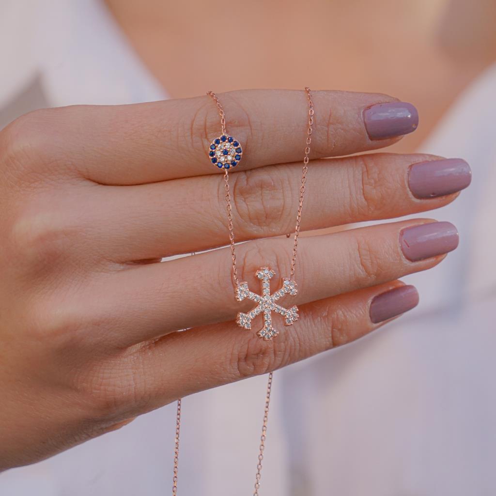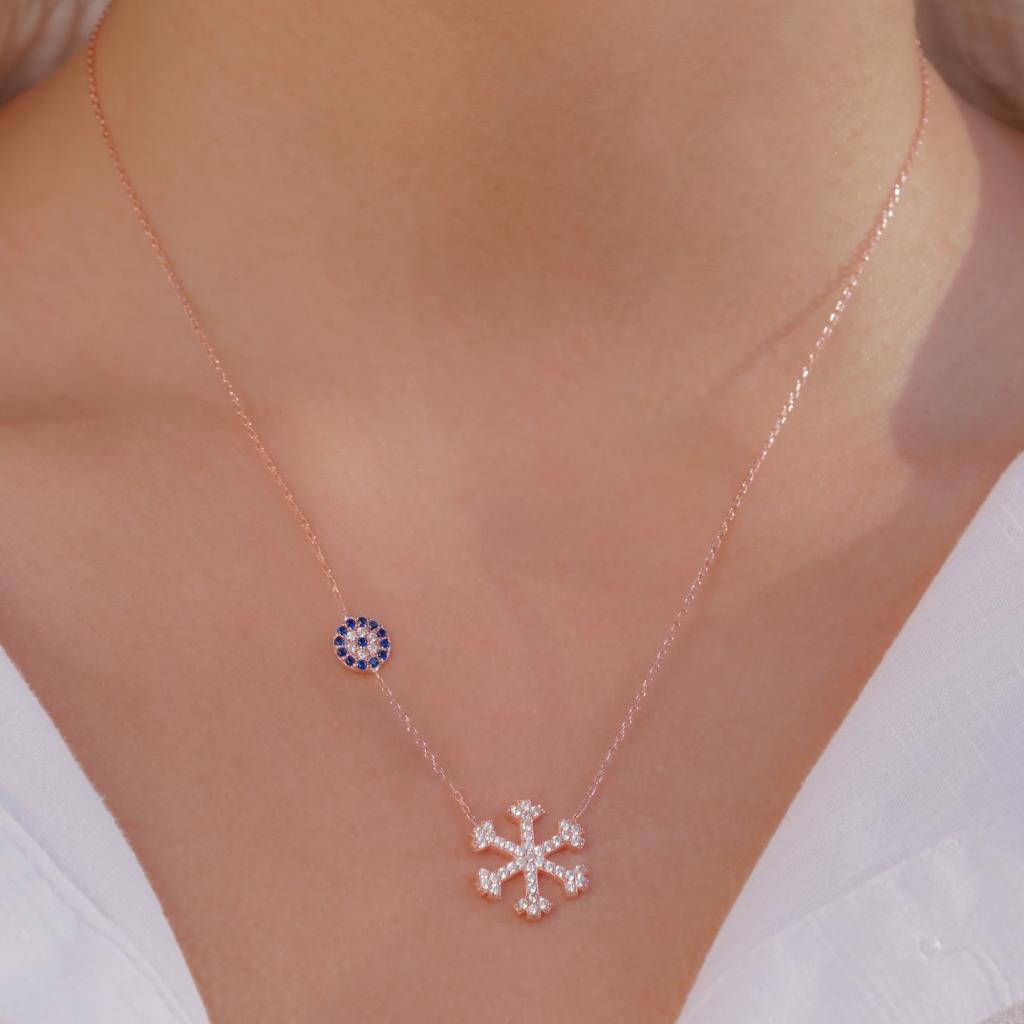 Snowflake and Evil Eye Design Rose Plated Silver Women Necklace